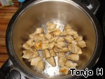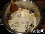 Выкладываем шампиньоны в кастрюлю к филе и все вместе ставим на огонь и еще немного тушим.