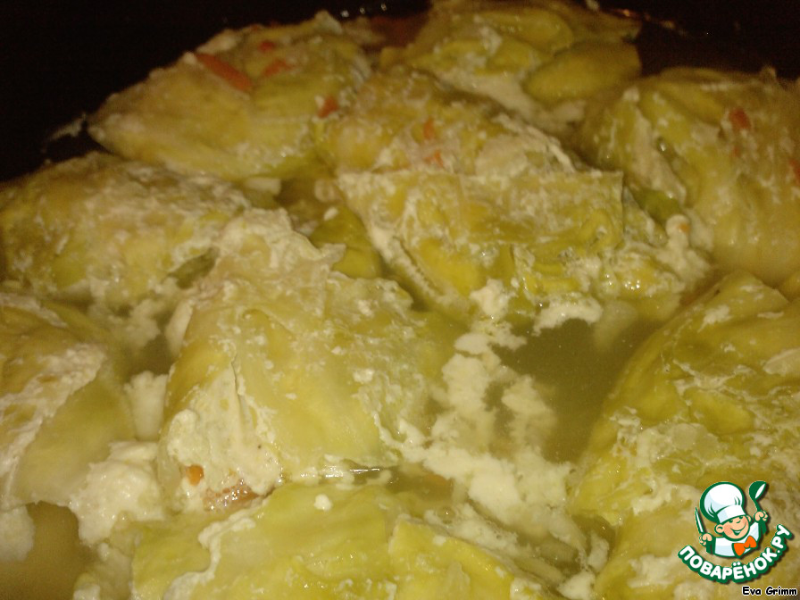 Выкладываем в глубокую посуду с тефлоновым покрытием или толстым дном, смешиваем воду+зажарку (или овощи)+сметана (специи по вкусу), заливаем рулеты и ставим на средний огонь до закипания на 15 мин....