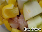 Куриную грудку, перец и кабачок нарежем и выложим в блендер