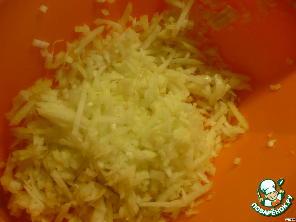 Оставшийся лук шинкуем четвертькольцами очень-очень тонко, смешиваем со второй половиной чеснока, помнем немного.