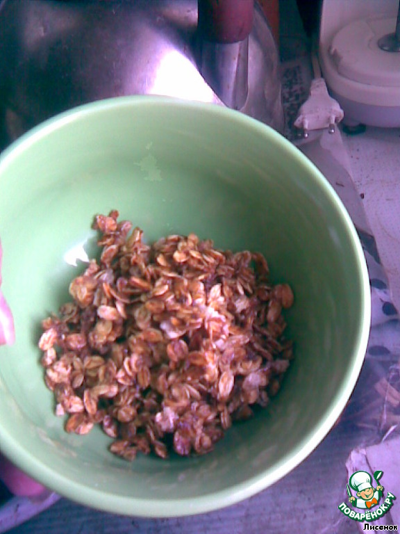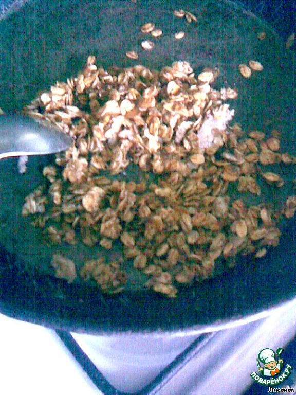 Овсяные хлопья обжарить на сухой сковородке с 2 ст.л. сахара. -