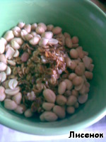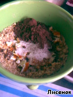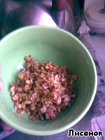 Остывшие хлопья истолочь с орехами (орехи тоже желательно немного обжарить).