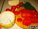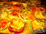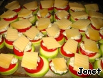Противень смазать растительным маслом, выложить кружочки кабачков, на них помидорчики.