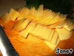 Сыр, обязательно твёрдый, режем пластинками примерно 4х3 или 4х4.