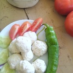 К огромному моему сожалению фотографии, как я делала шарики, не переносятся на компьютер - какой-то сбой. Но постараюсь объяснить. Застилаем стол пищевой пленкой. Сыр снова достаем из горячей воды, скатываем из него колбаску, плотно оборачиваем пленкой и тонкой веревочкой туго перевязываем колбаску узелками. Таким образом формируем и отделяем шарики.