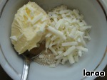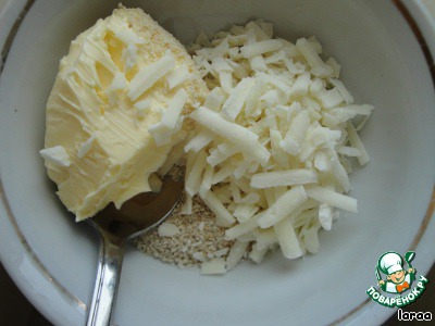 Мягкое сливочное масло, панировочные сухари или хлебные крошки и натертый сыр перемешать в однородную массу. -