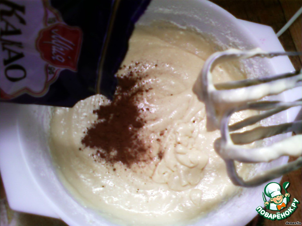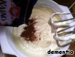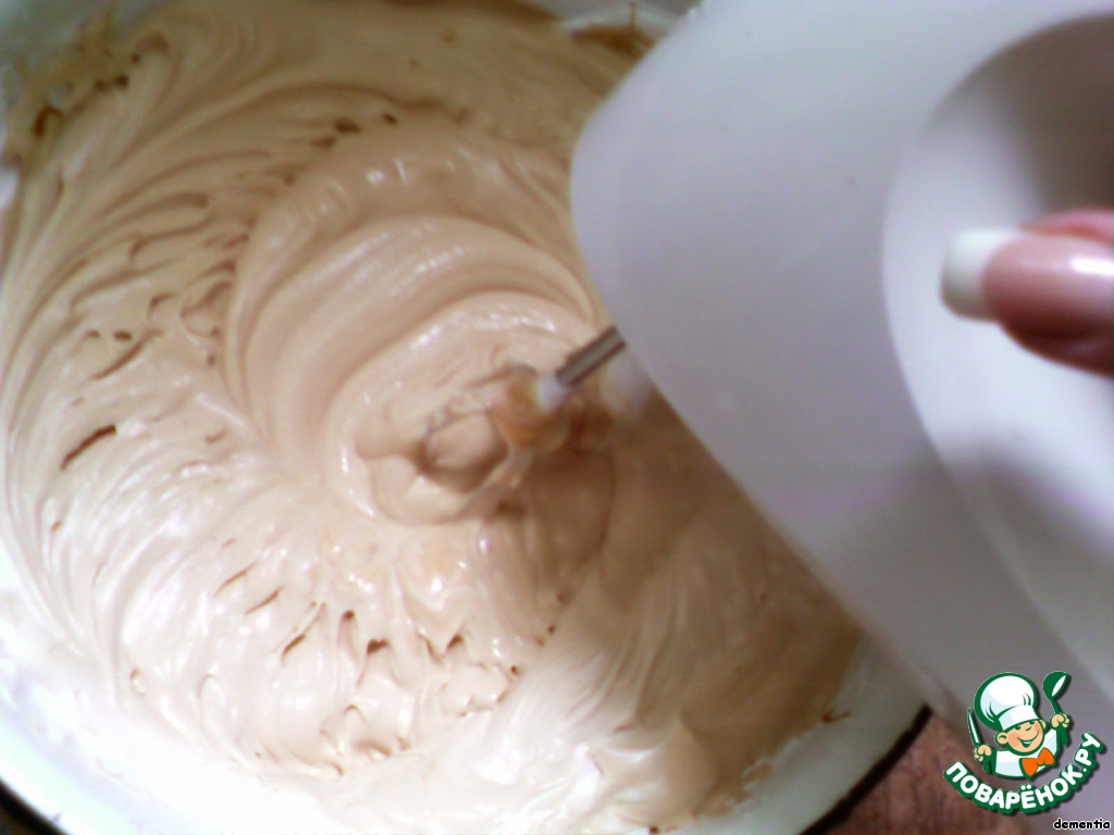 Делим получившуюся массу на 2 части. В 1 добавляем ликер, взбиваем. |