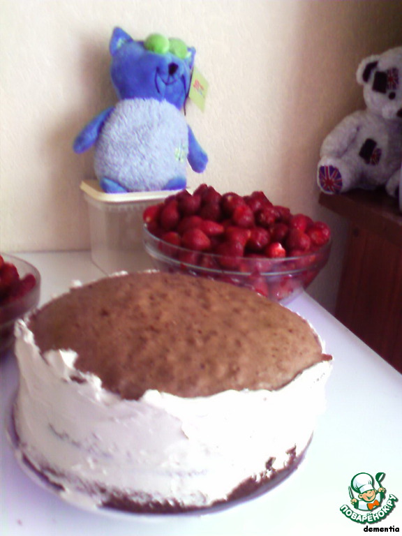 На каждый корж сперва выкладываем порезанную на дольки клубнику, сверху крем. При желании, сверху крема можно еще клубнички добавить. |