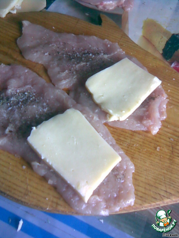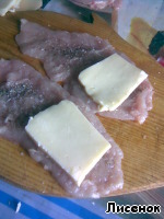 На каждый кусочек мяса кладем кусочек сыра. Берите куски побольше, для себя любимых ведь стараемся!!!;-) ;-) -