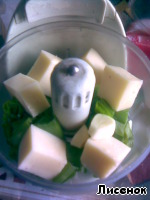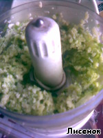 В процессор закладываем зеленый лук, остатки сыра и чеснок (ну, грешна, полюбляю я это дело :-[ :-[ ). Чеснок для аромата, кто не хочет, не добавляет.