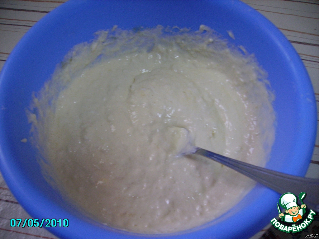 Тесто: смешать в миске - сметану, майонез, яйца, муку, разрыхлитель и сахар до однородной массы.