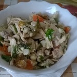 Нарезаем куриное филе (или на волокна разбираем, как кому нравится). Режем зелень.
