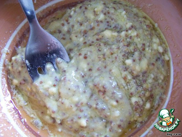 Для заправки растираем желток, перемешиваем его с горчицей, вливаем масло, все перемешиваем.
