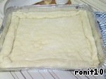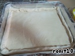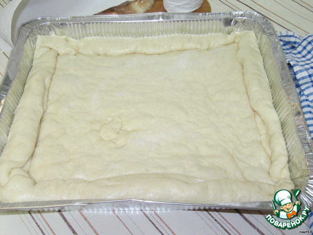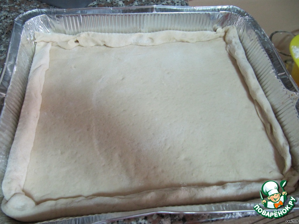 Большой противень смазываем растительным маслом. Раскатываем тесто и переносим на противень. -