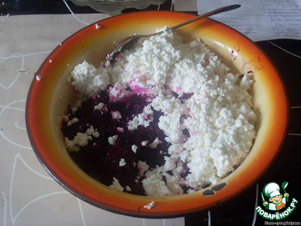 Свеклу натереть на крупной терке. Если слишком сочная, то лишний сок сцедить. С творога также сцедить сыворотку. Смешать свеклу и творог. Кстати, у меня ушло три небольшие свеклы. Купила молоденькие.