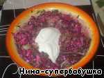 Добавить пропущенный через пресс чеснок, соль и кориандр. Все тщательно перемешать. Заправить майонезом и еще раз перемешать.