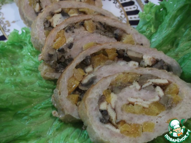 Полить рулет оставшимся от вымачивания кураги вином, добавить с полстакана воды и поставить в горячую духовку. Запекать в течении 40 минут при температуре 200*С.