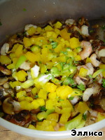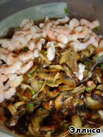 Посыпаем измельченным чесноком, чайной ложкой рубленой зелени и большим количеством перца. Аккуратно перемешиваем и даем постоять 30 минут. Солим грибную массу, добавляем креветки, сладкий перец и хорошо перемешиваем.