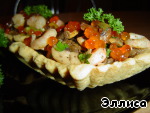 Для начинки обжариваем на части масла лук и грибы, нарезанные тонкими ломтиками, охлаждаем и добавляем оставшееся масло и сок лимона.