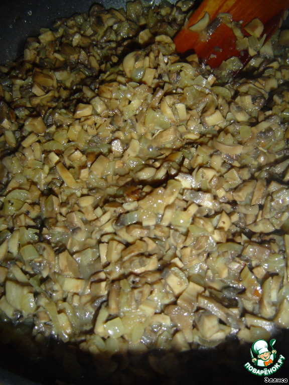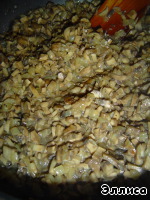 Затем добавляем мелко нарезанные грибы, накрываем крышкой и тушим 15 минут. Снимаем крышку, увеличиваем нагрев и выпариваем жидкость (но грибы должны остаться влажными). Добавляем еще 50 г масла и даем остыть. -