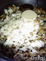 К грибам добавляем хлебные крошки, сыр, соль, перец, оставшееся масло и смешиваем с помощью блендера до однородной массы.