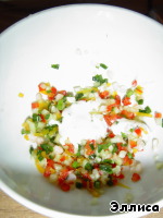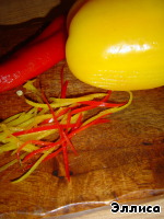 Болгарский перец натираем на терке для корейской моркови, большую часть мелко нарезаем, а часть оставляем для украшения.
