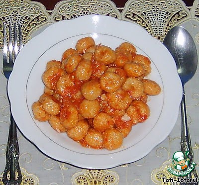 Вот уже готовы наши котлетки и мы заливаем их томатно-чесночным соусом.