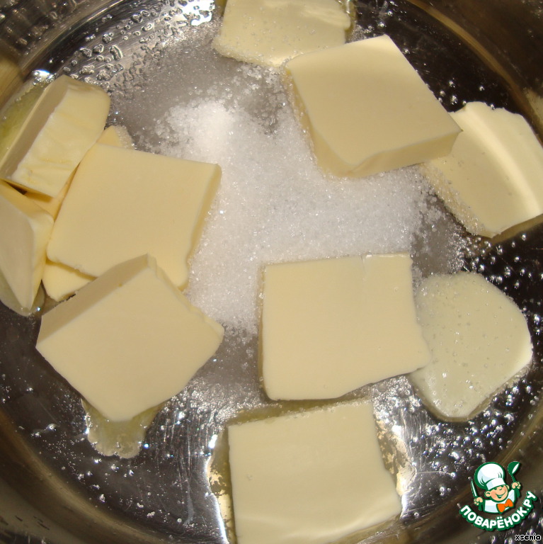Здравствуйте!!! В сахар добавляем 2 столовых ложки воды, нагреваем на медленном огне. Добавляем масло. Нагреваем до тех пор, пока сахар не растворится. |