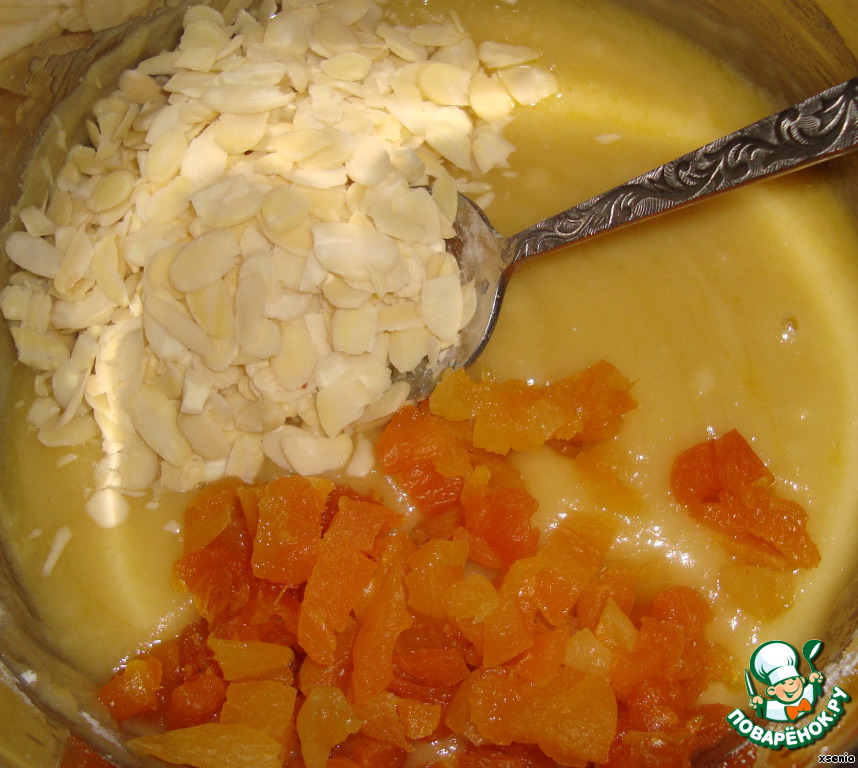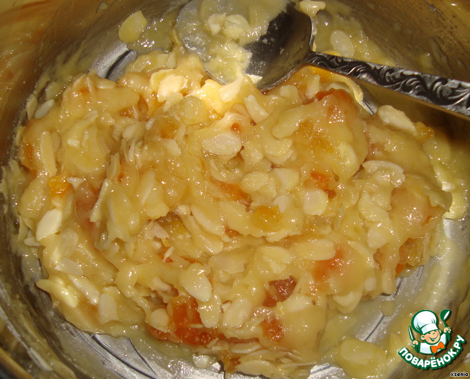 В растопленное масло добавляем муку. Хорошо перемешиваем, добавляем мелко нарезанную курагу и резаный миндаль |
