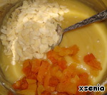 В растопленное масло добавляем муку. Хорошо перемешиваем, добавляем мелко нарезанную курагу и резаный миндаль