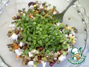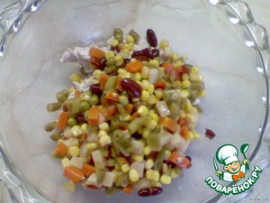 Соединить все ингредиенты, перемешать и заправить майонезом.