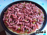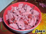 Колбасу режу небольшими ломтиками, в целом получается вот такая вот мисочка