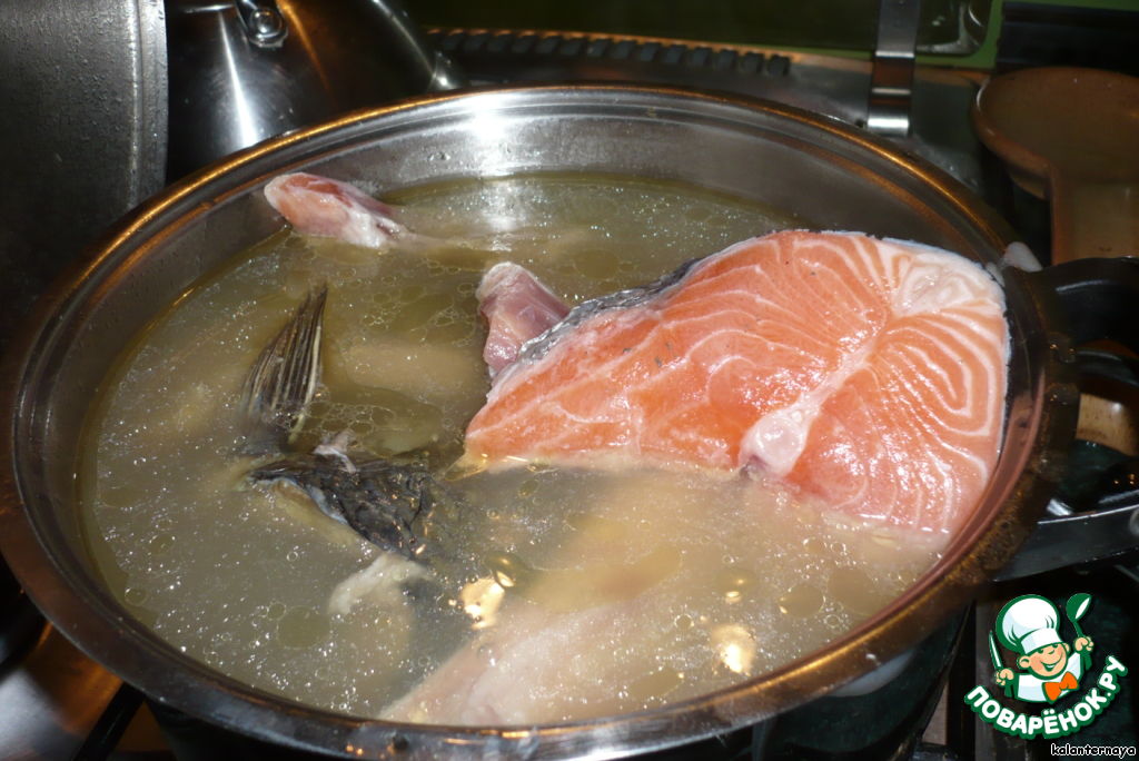 Поварили, и хватит. Достаем куру, вместо нее закладываем рыбу. Опять-таки, я сильно не парюсь, беру суповые наборы. У меня был карп, лобан и лосось. Вот лосось или форель - обязательно. Семга - тоже хорошо.