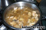 Рыбу делим на крупные кусочки, кости выбрасываем, закладываем все в бульон отцеженный, опять на маленький огонь.