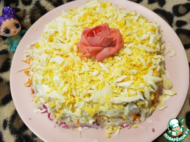 Затем натереть на терке редьку и положить сверху, посолить, положить майонез,