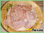 Филе куриной грудки нарезать кусочками размером 2,5 х 2,5 см. -