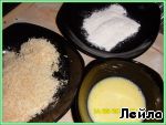 В третьей тарелке смешать хлебные крошки и натертый пармезан (голландский сыр). -