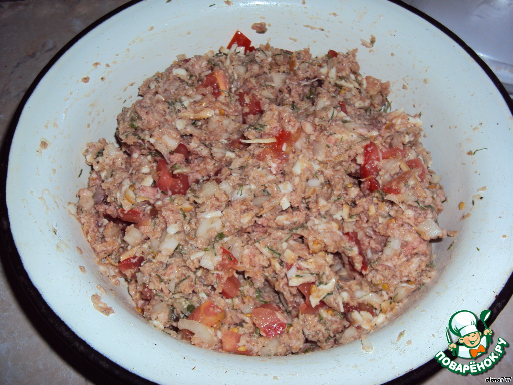 Для начинки: смешать фарш (или порезанное мясо), нарезанные помидоры, сыр, тёртый на крупной тёрке, нарезанную зелень укропа, мелко порезанный лук, яйцо, выдавленный чеснок.