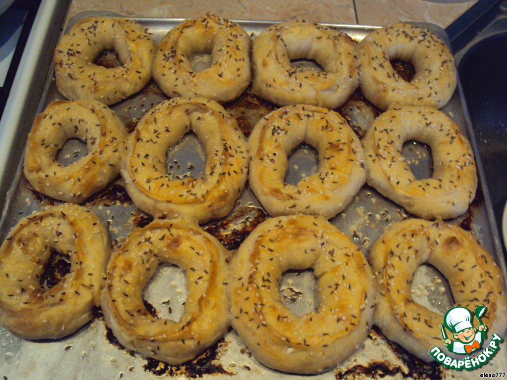 Вкусные закусочные колечки из пресного теста, обсыпанные кунжутом и тмином, с начинкой из мясного фарша, копчeного сыра, свежего помидора и зелени. Лeгкий аромат чесночка, кориандра и базилика придаeт этим аппетитным колечкам приятную пикантность! Заходите, угощайтесь!