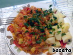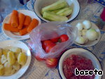 Не судите строго, это мой дебют! Подобных рецептов много и, может быть, я повторяюсь... но очень захотелось попробовать себя в роли поваренка... Рагу из помидорчиков, кабачков, морковки, лука и фарша.