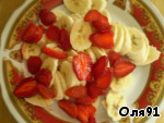 выкладываем аккуратно наши фрукты (я делала слой бананов, а сверху клубничку) и заливаем оставшимся тестом.