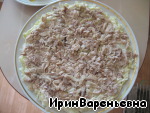 теперь выкладываем мясо, нарезанное на мелкие кусочки или разобранное на волокна...... и опять смазываем майонезом