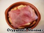 Сверху кладём пару тонких ломтиков ветчины. Ничего не солить!