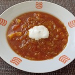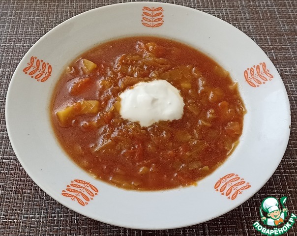 Как только все закипит (после добавления капусты), начинаем добавлять томатный соус. Обычно я использую "Краснодарский". Если такого у вас нет, кладите соус с кисло-сладким вкусом, желательно, чтобы в нем яблочко присутствовало. Нежный соус. Доводите до вкуса солью и приправами и выключаете. Борщ готов.