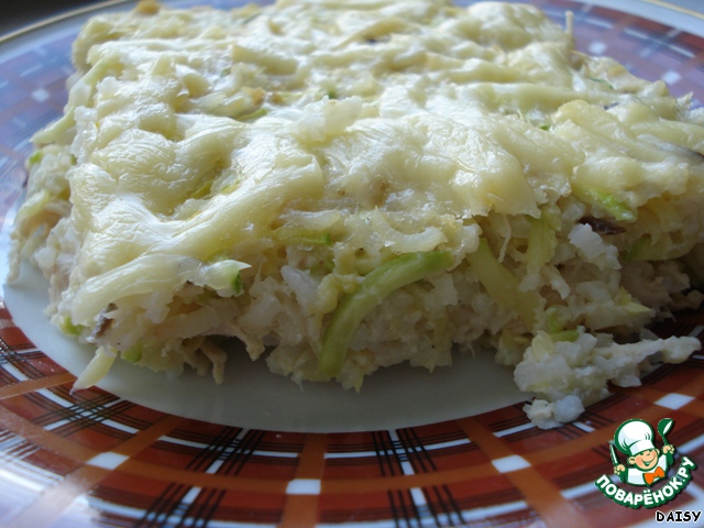 Кабачков каждое лето, просто море, не знали куда девать и этот рецепт стал настоящим спасением. Беру за основу кабачок, рис, чеснок. Остальное добавляю в зависимости от обстоятельств: курицу, мясо, сосиски и т.д., вместо яиц иногда кладу сметану - совсем другой вкус.