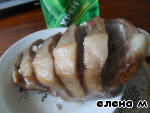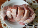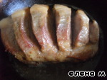 • Кусок свинины нарезать "гармошкой" (не дорезая куски до конца), посыпать приправой, перцем, сахаром.