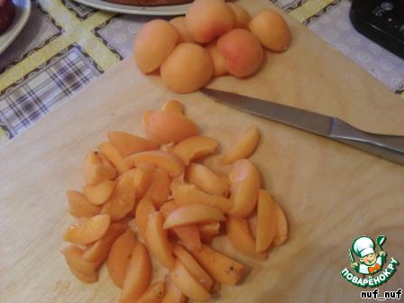 В саварен кладутся разные фрукты и ягоды, а также цукаты и орехи на ваш вкус, особенно популярен саварен с клубникой. Я выбрала абрикосы. Сразу отложим 5-6 штук для украшения, остальные абрикосы порезать на дольки.