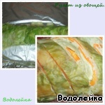 При помощи фольги свернуть овощи в рулет (поплотнее), завернуть в фольгу и поставить в духовку при 180*С примерно на час (по крайней мере, у меня рулет стоял столько времени).