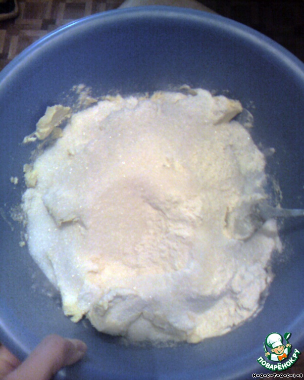Готовим посыпку. Масло (слегка размягченное) засыпаем мукой и сахаром, добавляем ложку кефира (если его нет, то можно и обойтись).