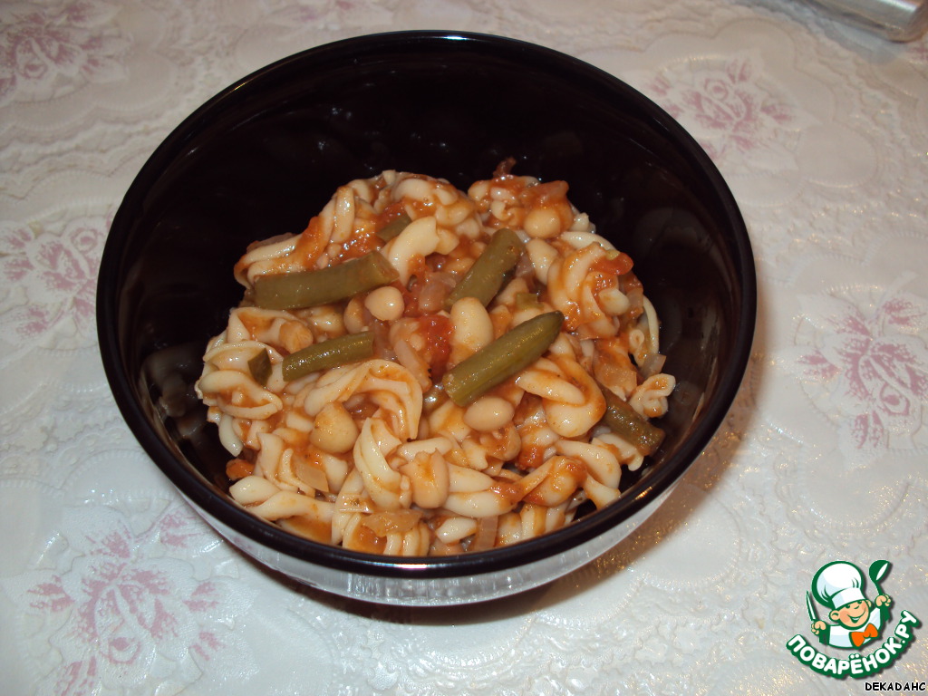 Стручковую фасоль откинуть на дуршлаг вместе с белой фасолью и макаронами